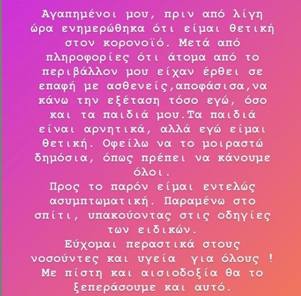 Συγκεκριμένα η αοιδός είχε αναφέρει: «Θετικό το τεστ Covid-19 φίλοι μου και πιστέψτε με μεγάλη η ταλαιπωρία και η εξάντληση… το πιο δύσκολο για μένα είναι ότι πρέπει να στερηθώ τα παιδιά μου. Σκέφτομαι πόσο αντιδραστική ήμουν στην περίοδο της καραντίνας και πόσο καχύποπτη με όλη την κατάσταση. Τώρα λοιπόν που έχω κορονοϊό και βιώνω προσωπικά αυτόν τον τόσο αμφιλεγόμενο ιό… έχω να πω απλά προσοχή… προσέξτε τους εαυτούς σας, την υγεία σας και την υγεία των συνανθρώπων σας… θέλουμε δεν θέλουμε να το πιστέψουμε θα υπάρχει και θα συνεχίσει να υπάρχει δυστυχώς για πολύ καιρό ακόμη απ’ ότι φαίνεται. Να προσέχετε όσο περισσότερο μπορείτε»!