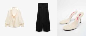 Για να προσεγγίσεις το outfit της Υβόννης θα χρειαστείς τα ρούχα και τα πέδιλα που θα δεις στην εικόνα παρακάτω από το Zara. Ας ξεκινήσουμε από την μπλούζα, η οποία είναι σατινέ, με ριχτό ντεκολτέ, γιακά και μακριά μανίκια. Κοστίζει μόνο 19,99 € (κωδικός: 7969/027). Θα το συνδυάσεις με φαρδιά μαύρη ψηλόμεση παντελόνα με πιέτες μπροστά και φαρδιά μπατζάκια. Βρίσκεται στα 9,99 € (κωδικός: 2243/645). Τέλος, θα ολοκληρώσεις αυτό το λουκ με διάφανα πέδιλα. Η τιμή τους ανέρχεται στα 25,99 € (κωδικός: 1328/910).