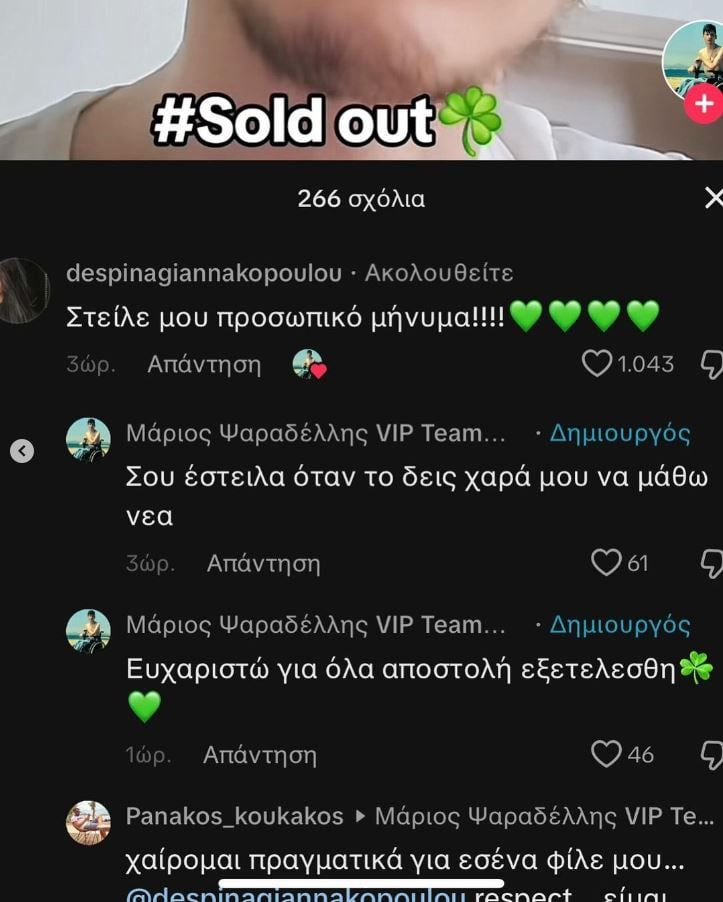 Ο Μάριος ανέβασε ένα βίντεο στο Tik Tok στο οποίο ήταν αρκετά στενοχωρημένος που δεν πρόλαβε να πάρει εισιτήριο για το μεγάλο ματς. Η Δέσποινα Γιαννακοπούλου το είδε και του έγραψε στα σχόλια να της στείλει προσωπικό μήνυμα.