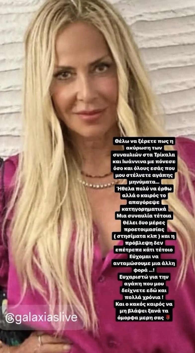 «Θέλω να ξέρετε πως η ακύρωση των συναυλιών στα Τρίκαλα και Ιωάννινα με πόνεσε όσο και όλους εσάς που μου στέλνετε αγάπης μηνύματα. Ήθελα πολύ να έρθω αλλά ο καιρός το απαγόρευσε κατηγορηματικά. Μια τέτοια συναυλία θέλει δυο ημέρες προετοιμασίας και η πρόβλεψη δεν επέτρεπε κάτι τέτοιο. Εύχομαι να ανταμώσουμε μια άλλη φορά! Ευχαριστώ για την αγάπη που μου δείχνετε εδώ και πολλά χρόνια. Και ο κακός καιρός να μη βλάψει ξανά τα όμορφα μέρη σας», έγραψε η Άννα Βίσση στα Instagram Stories της.