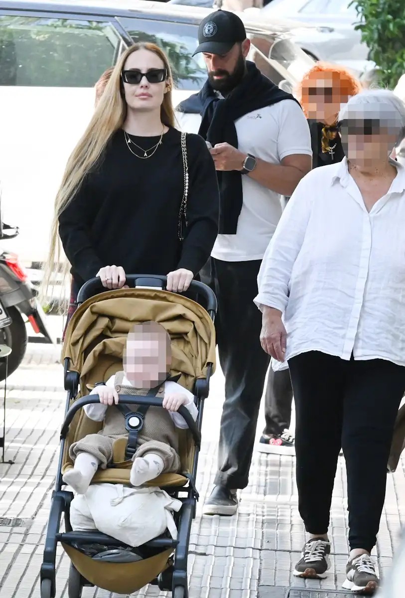 Η Αντωνία Καλλιμούκου έκανε τη βόλτα της στη Βουκουρεστίου, κρατώντας το καρότσι με το μωράκι της, ενώ ο σύζυγός της βρισκόταν στο πλευρό της.