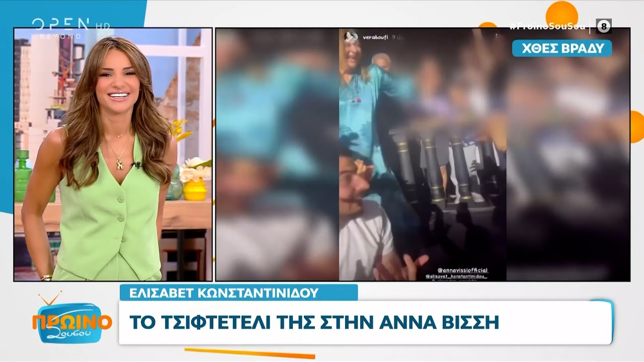 Η Ελισάβετ Κωνσταντινίδου είπε στη συνέχεια για την Άννα Βίσση: «Είναι δοτική, είναι γλυκιά, είναι συντροφική. Πραγματικά, θα ήθελα να είμαι άντρας και να την πήγαινα στα ουράνια. Αυτή η γυναίκα είναι για αγκαλιές. Ενώ την βλέπεις πάνω στην σκηνή και λες θα τρελαθώ, τι ενέργεια, τα έχω χάσει μαζί της, στο σπίτι είναι κοριτσάκι».