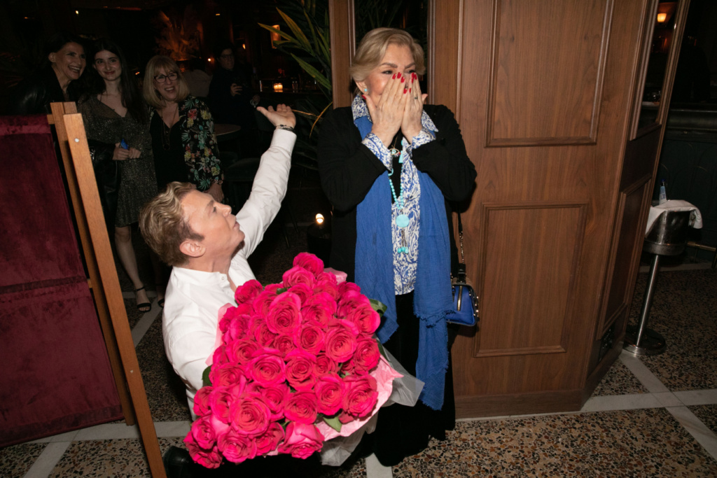 Ένα μεγάλο μπουκέτο τριαντάφυλλα της πρόσφερε ο μοναδικός performer Τάκης Ζαχαράτος και αργότερα όλοι μαζί απόλαυσαν το δείπνο που είχε επιμεληθεί η ομάδα του μαγαζιού, ειδικά για την αγαπημένη καλλιτέχνιδα.