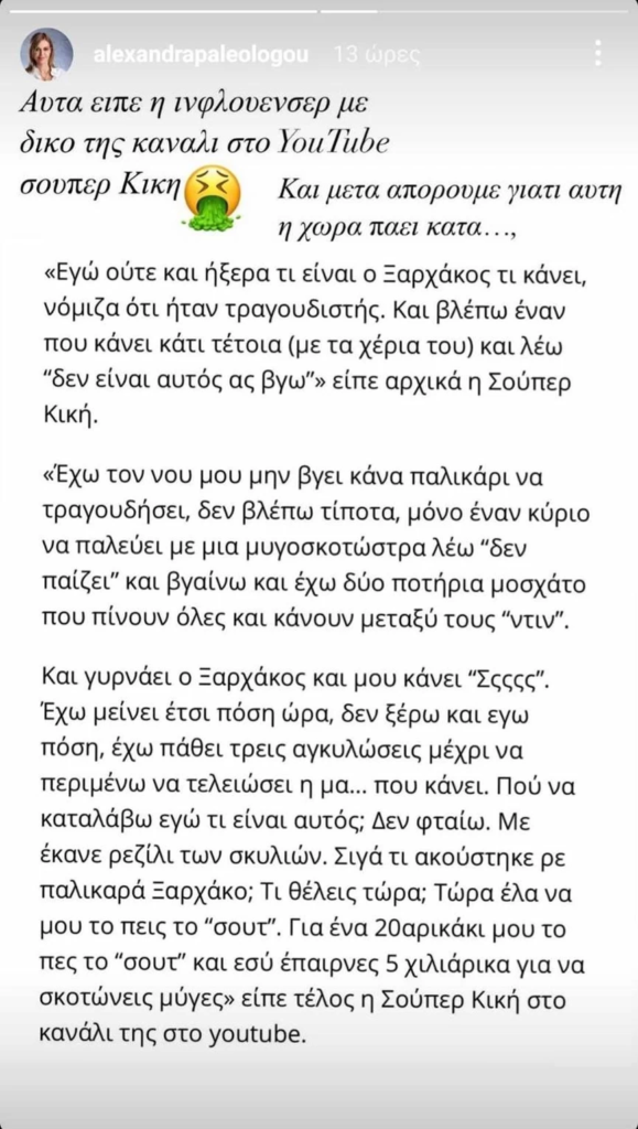 Ωστόσο, η Αλεξάνδρα Παλαιολόγου, δημοσίευσε απόσπασμα των λεγομένων της στα instastories και έγραψε: «Αυτά είπε η influencer με δικό της κανάλι στο Youtube. Και μετά απορούμε γιατί αυτή χώρα πάει κατά…».