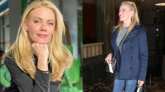 Το υπόλοιπο σύνολό της αποτελούνταν από ένα skinny τζιν, ένα γκρι πουλόβερ και ένα κομψό peacoat-παλτό σε σκούρα μπλε απόχρωση. Η παρουσιάστρια προτίμησε μίνιμαλ styling στα αξεσουάρ της, συμπληρώνοντας το look της με μία γκρι τσάντα. Τα sneakers της είναι εκείνα που έδωσαν μία πιο σύγχρονη και ιδιαίτερη ματιά στο λιτό σύνολό της.