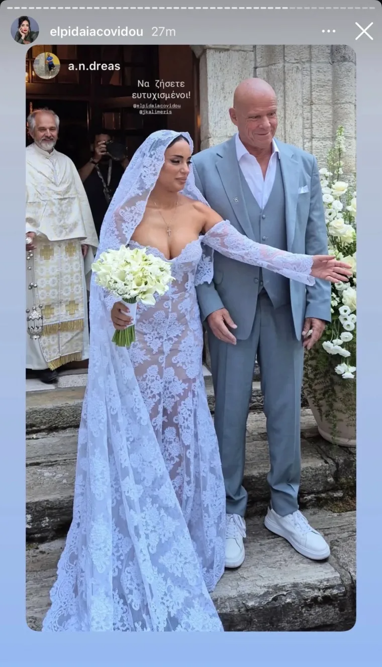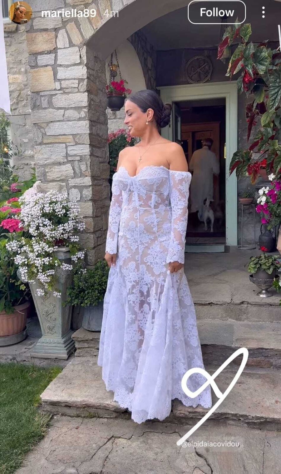Η Ελπίδα Ιακωβίδου εμφανίστηκε με ένα μοναδικό νυφικό από λευκή δαντέλα, σε γραμμή που αγκάλιαζε το σώμα της και αναδείκνυε τη θηλυκότητά της.