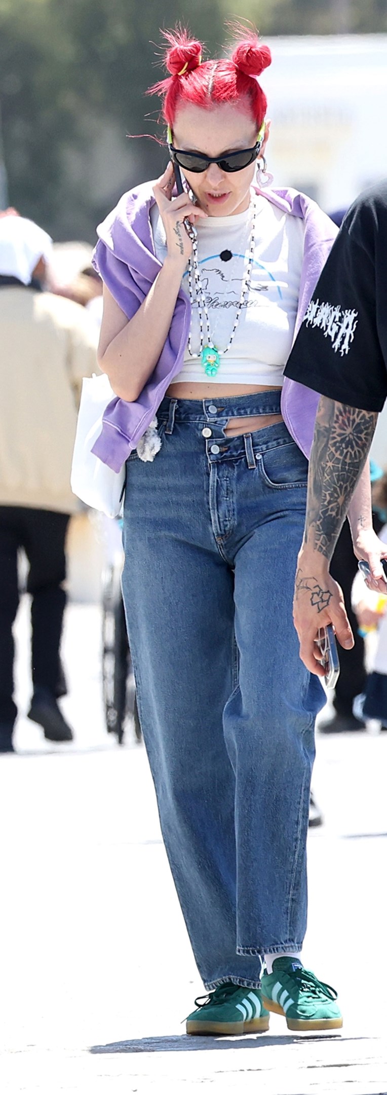 Η Τάμτα επέλεξε να φορέσει ένα ψηλόμεσο τζιν παντελόνι το οποίο συνδύασε με πράσινα αθλητικά παπούτσια, λευκό μπλουζάκι και λιλά φούτερ, ενώ τα μαλλιά της είναι βαμμένα σε μια κοκκινο-φούξια απόχρωση. Το παντελόνι της διακρίνεται για το ιδιαίτερο στυλ του, με διπλό κούμπωμα και cut out στο σχέδιό του.