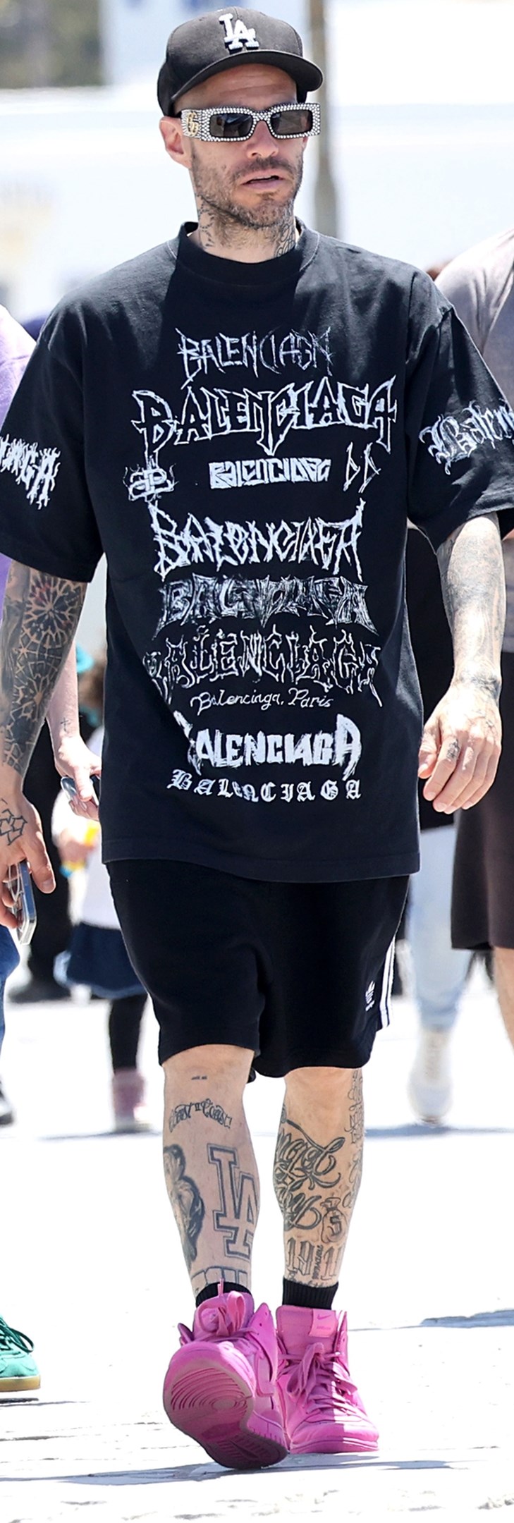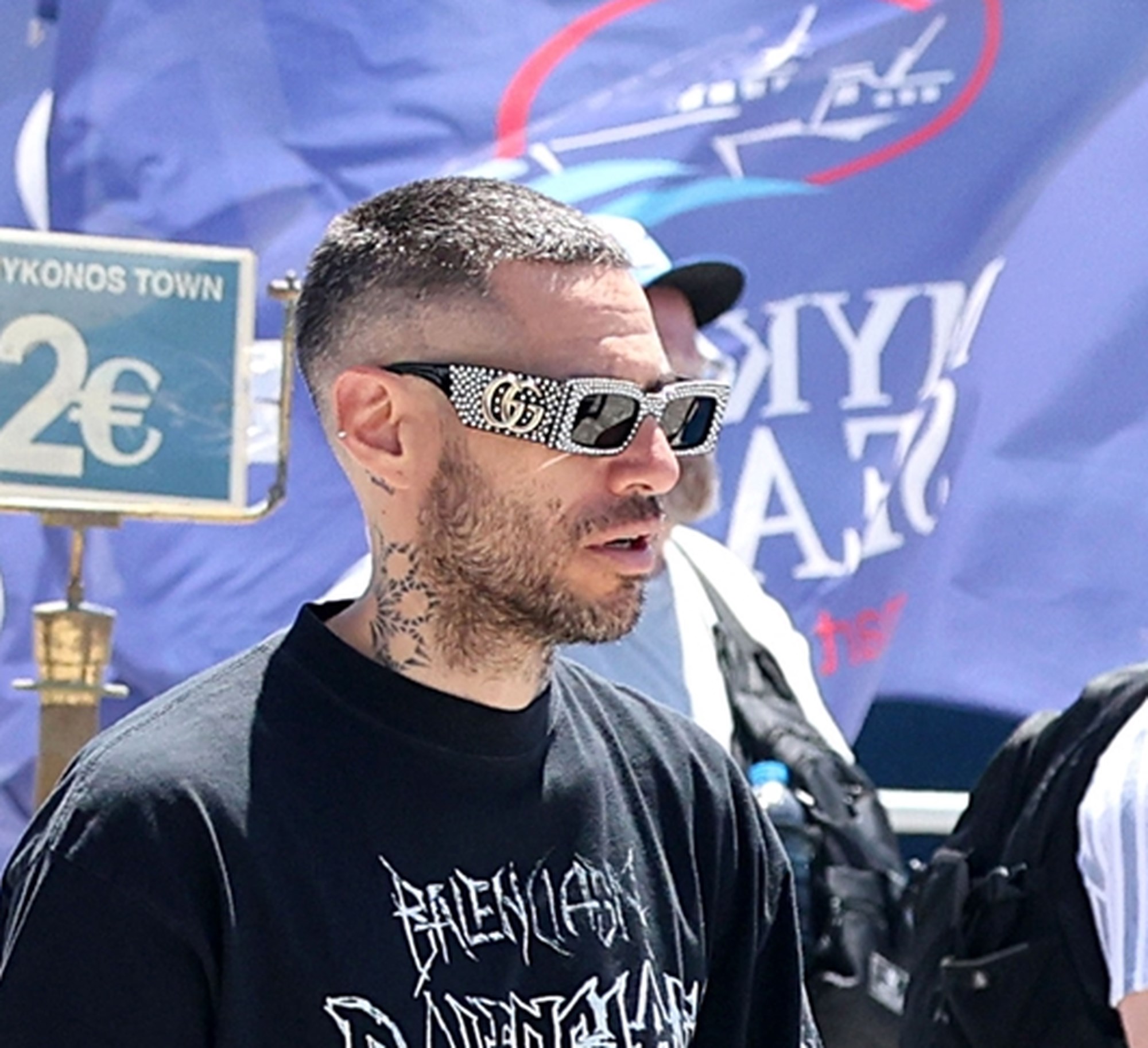Όσον αφορά τον γιο της Μαριάννας Λάτση, φορούσε μαύρη βερμούδα και μπλουζάκι με λευκό τύπωμα. Τα γυαλιά του ήταν εντυπωσιακά, από το γνωστό brand Gucci, γεμάτα με κρύσταλλα Swarovski. Επιπλέον, πρόσθεσε στο σύνολό του ένα ζευγάρι φούξια αθλητικά παπούτσια.