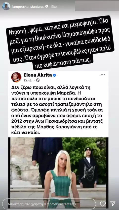 «Ντροπή, ψέμα, κατινιά και μικροψυχία. Όλα μαζί για τη βουλευτίνα/δημοσιογράφο προς μια εξαιρετική -σε όλα- συνάδελφό μας. Όταν έγραφε τηλενουβέλες ήταν πολύ πιο ευφάνταστη πάντως», ήταν το σκληρό σχόλιο που έκανε ο Λάμπρος Κωνσταντάρας για την Έλενα Ακρίτα.
