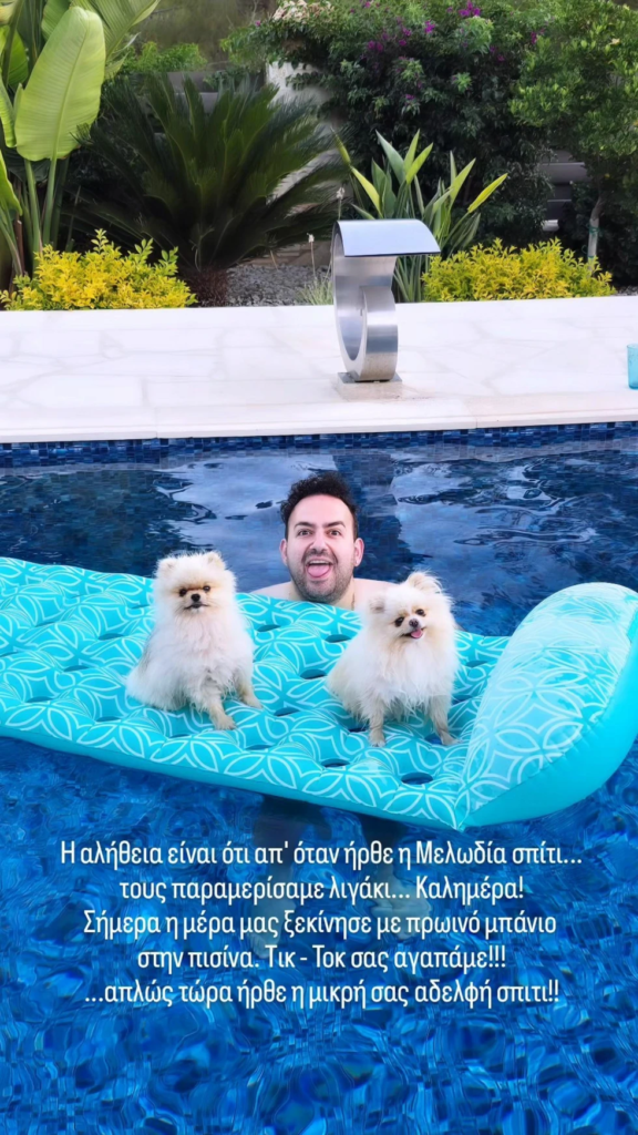 Ο Μαυρίκιος Μαυρικίου μάλιστα έκανε και μια ανάρτηση στο Instagram Story του αναφέροντας: «Η αλήθεια είναι ότι απ’ όταν ήρθε η Μελωδία σπίτι… τους παραμελήσαμε λιγάκι. Καλημέρα. Σήμερα η μέρα μας ξεκίνησε με πρωινό μπάνιο στην πισίνα. Τικ Τοκ σας αγαπάμε. Απλώς, τώρα ήρθε η μικρή σας αδελφή».