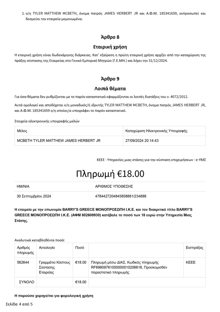 Αυτό προκύπτει από την σύσταση, σήμερα Δευτέρα 30 Σεπτεμβρίου, μιας νέας εταιρείας και συγκεκριμένα της εταιρείας με την επωνυμία «Barry’s Greece Μονοπρόσωπη Ι.Κ.Ε.»