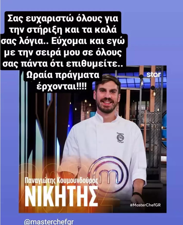 Λίγες ώρες μετά το φινάλε, ο νέος Έλληνας MasterChef άνοιξε ξανά τον λογαριασμό του στο Instagram και έστειλε το πρώτο του μήνυμα. «Σας ευχαριστώ όλους για τη στήριξη και τα καλά σας λόγια. Εύχομαι και εγώ με τη σειρά μου σε όλους σας πάντα ό,τι επιθυμείτε. Ωραία πράγματα έρχονται» έγραψε ο Παναγιώτης Κουμουνδούρος.