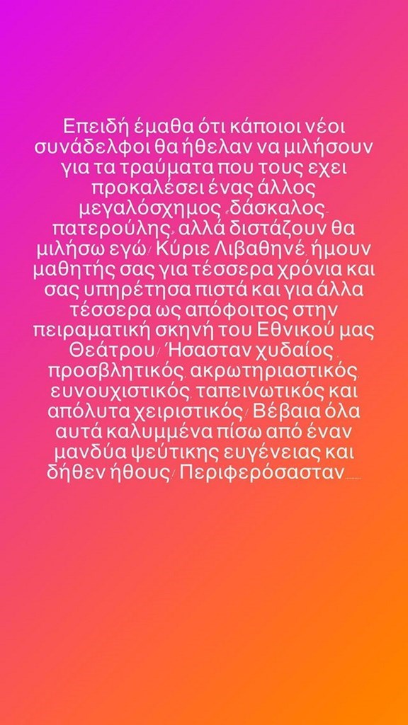 Ο Παναγιώτης Μπουγιούρης πριν από λίγες ημέρες μέσα από τον προσωπικό του λογαριασμό στο Instagram, κατηγόρησε ανοιχτά τον σκηνοθέτη, Στάθη Λιβαθινό πως για τέσσερα χρόνια που ήταν μαθητής του στη δραματική σχολή ήταν χυδαίος, προσβλητικός, ευνουχιστικός και ταπεινωτικός.