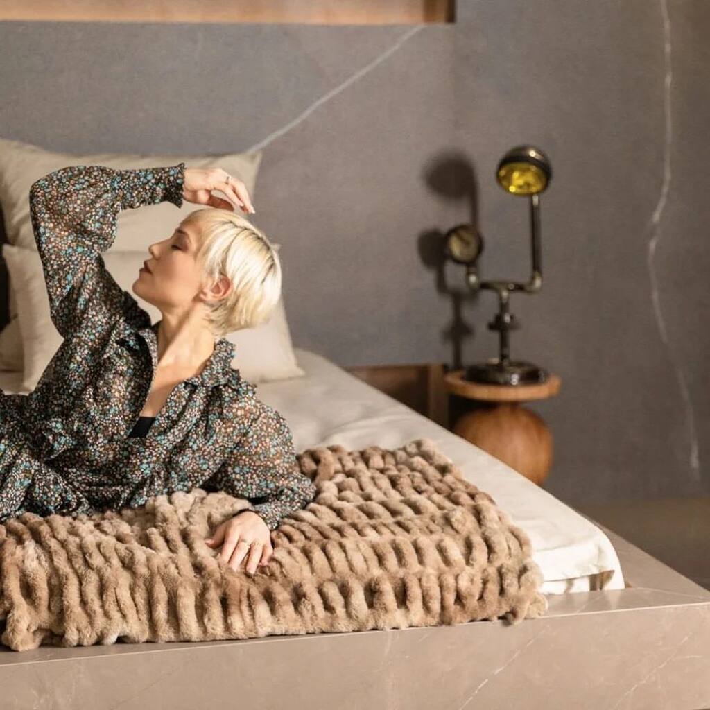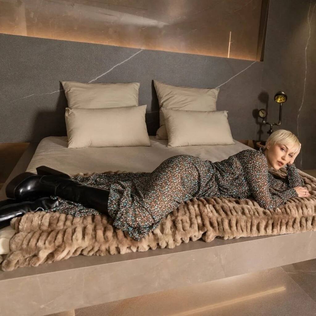 Στο σαλόνι κυριαρχούν το μοβ χρώμα και τα animal print μαξιλάρια, που δημιουργούν μία υπέροχη ατμόσφαιρα στον χώρο, ενώ στην κρεβατοκάμαρα του ζευγαριού, τα γήινα χρώματα δίνουν μία πιο ζεστή ατμόσφαιρα και η τεχνοτροπία του μαρμάρου στους τοίχους χαρίζουν περισσότερη πολυτέλεια.