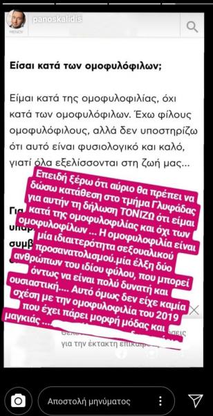 Μετά τις αντιδράσεις που προκλήθηκαν από τις δηλώσεις του σχετικά με την ομοφυλοφιλία, ο Πάνος Καλίδης αποφάσισε να πάρει θέση δημόσια και σε μήνυμά του στον προσωπικό του λογαριασμό στο Instagram, έγραψε: «Επειδή ξέρω ότι αύριο θα πρέπει να δώσω κατάθεση στο τμήμα Γλυφάδας για αυτή τη δήλωση, τονίζω ότι είμαι κατά της ομοφυλοφιλίας και όχι των ομοφυλόφιλων. Η ομοφυλοφιλία είναι μια ιδιαιτερότητα σεξουαλικού προσανατολισμού. Μία έλξη δύο ανθρώπων του ιδίου φύλου, που μπορεί όντως να είναι πολύ δυνατή και ουσιαστική. Αυτό όμως δεν έχει καμία σχέση με την ομοφυλοφιλία του 2019 που έχει πάρει μορφή μόδας και μαγκιάς».