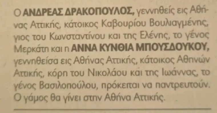 Όπως αναφέρεται στην αγγελία: «Ο Ανδρέας Δρακόπουλος, γεννηθείς εις Αθήνας Αττικής, κάτοικος Καβουρίου Βουλιαγμένης, γιος του Κωνσταντίνου και της Ελένης, το γένος Μερκάτη και η Άννα Κύνθια Μπουσδούκου, γεννηθείσα εις Αθήνας Αττικής, κάτοικος Αθηνών Αττικής, κόρη του Νικολάου και της Ιωάννας, το γένος Βασιλοπούλου, πρόκειται να παντρευτούν. Ο γάμος θα γίνει στην Αθήνα Αττικής».