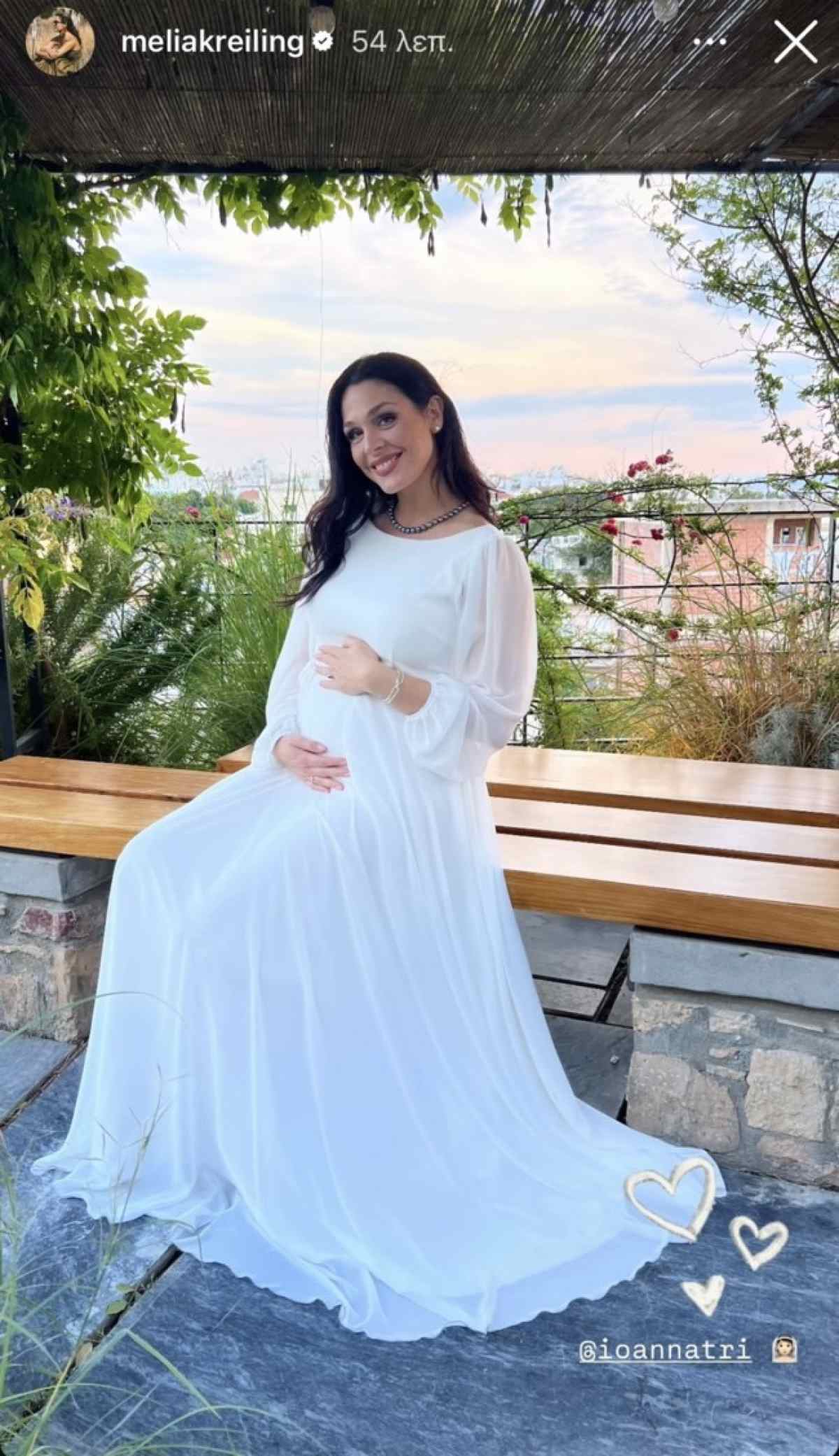 Η φωτογραφία δείχνει την Ιωάννα Τριανταφυλλίδου ντυμένη νύφη, με μια κομψή λευκή δημιουργία, να ποζάρει χαμογελαστή κρατώντας την φουσκωμένη κοιλιά της, ενώ στο φόντο φαίνεται ένα υπέροχο ηλιοβασίλεμα. Η Melia Kreiling συνόδευσε τη φωτογραφία με λευκές καρδιές και ένα emoji νύφης, χωρίς να αποκαλύψει περισσότερες λεπτομέρειες για την τελετή.