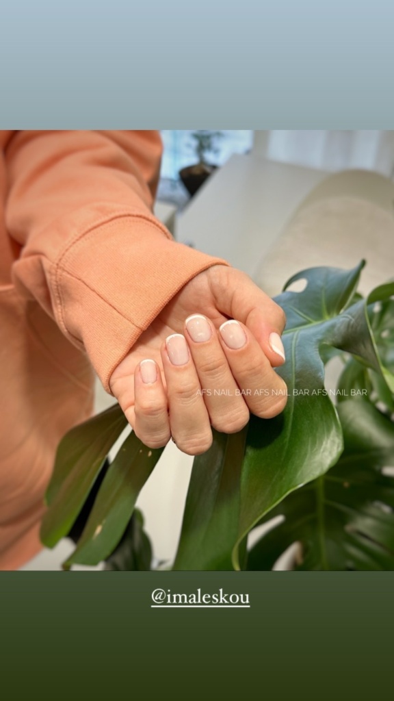Η Ιωάννα έμεινε πιστή στο αυθεντικό French mani, κάνοντας γαλακτερή βάση και λεπτή λευκή γραμμή, σε squoval σχήμα, δηλαδή σε ένα κράμα τετράγωνου και οβάλ. Το συγκεκριμένο μανικιούρ είναι passepartout, ταιριάζει σε κάθε περίσταση και με όλα τα στυλ, ενώ είναι και η ιδανική επιλογή για νύφες. Απλό, λιτό και κομψό.