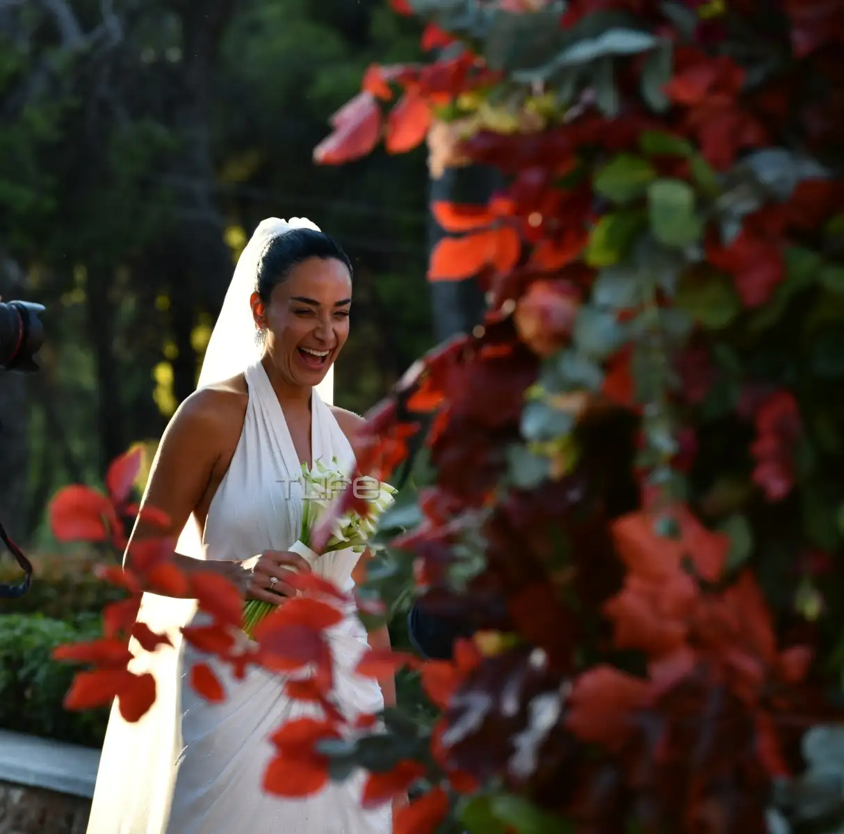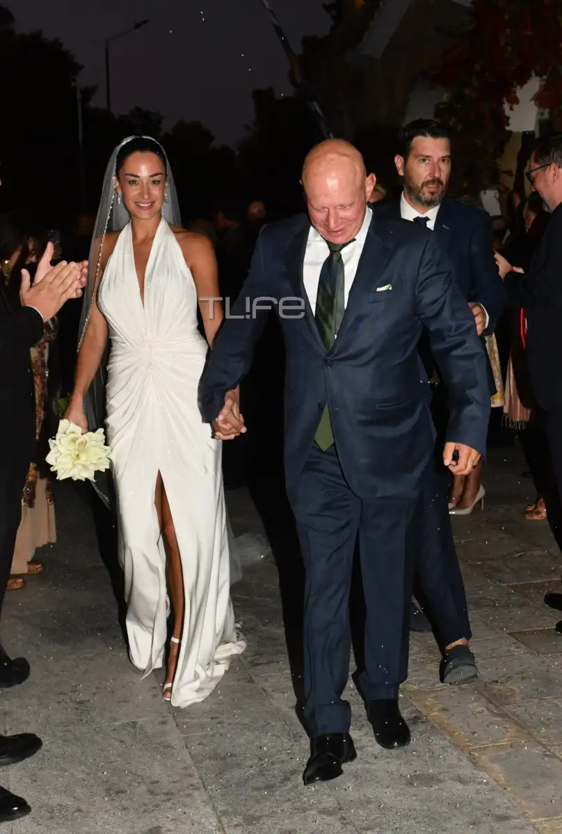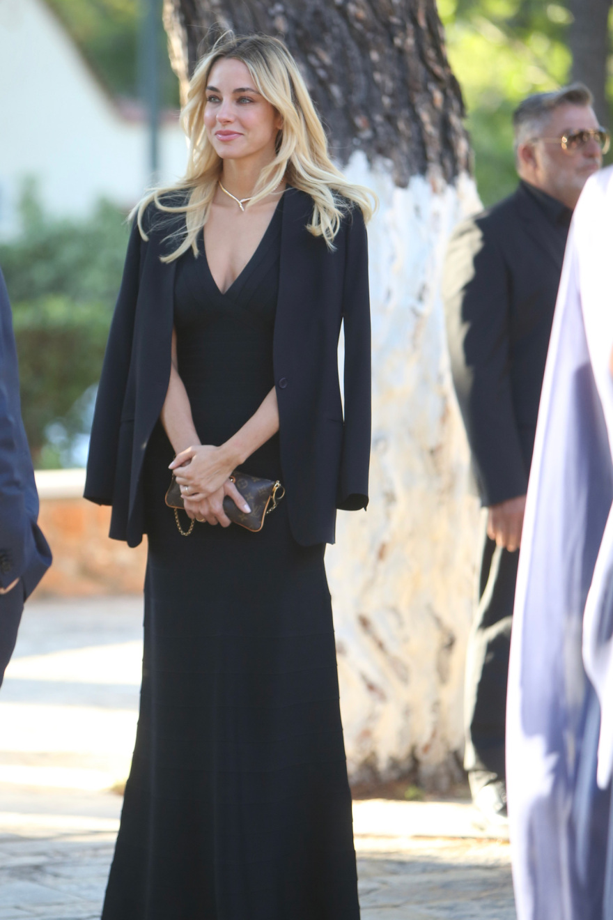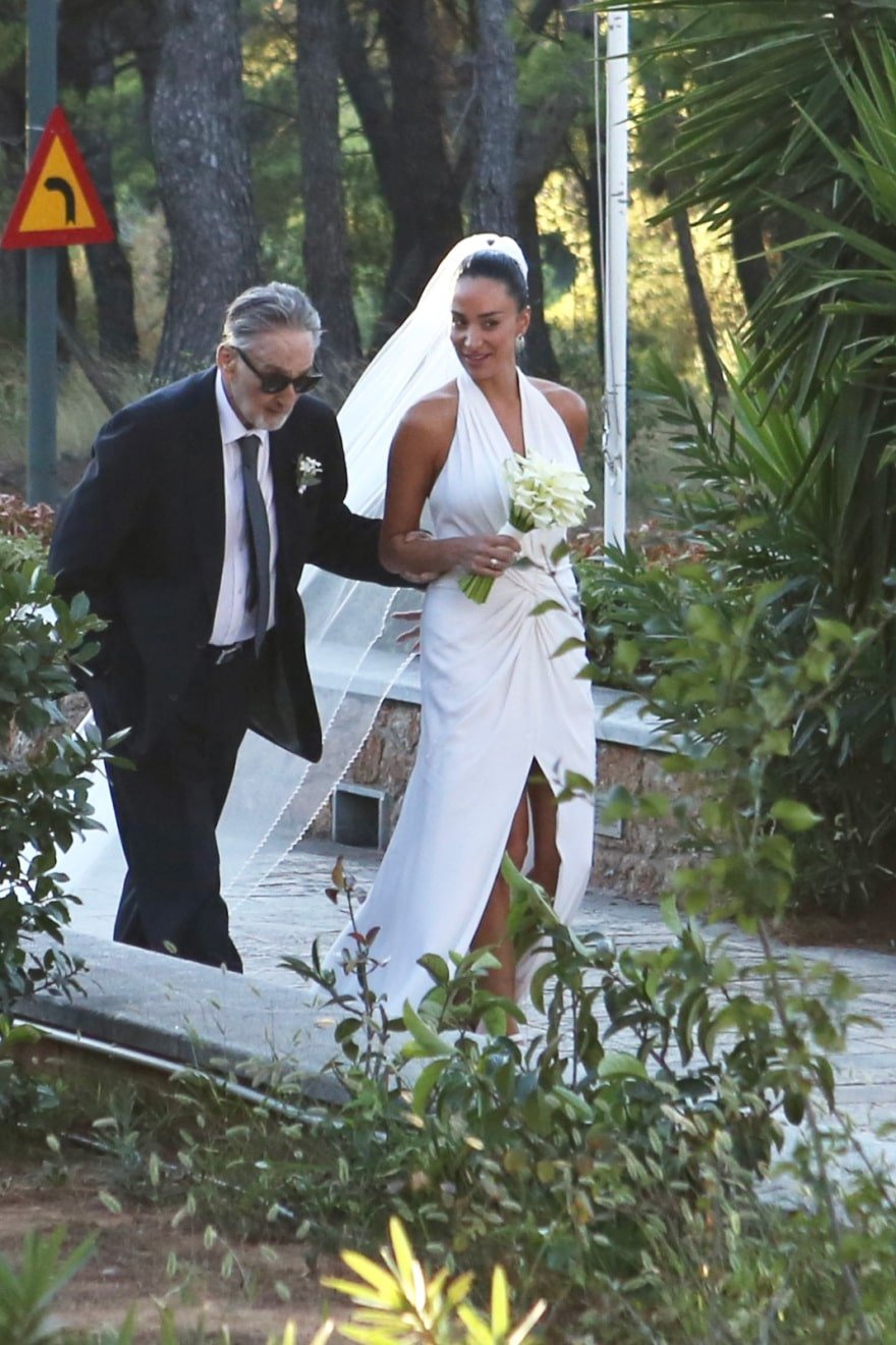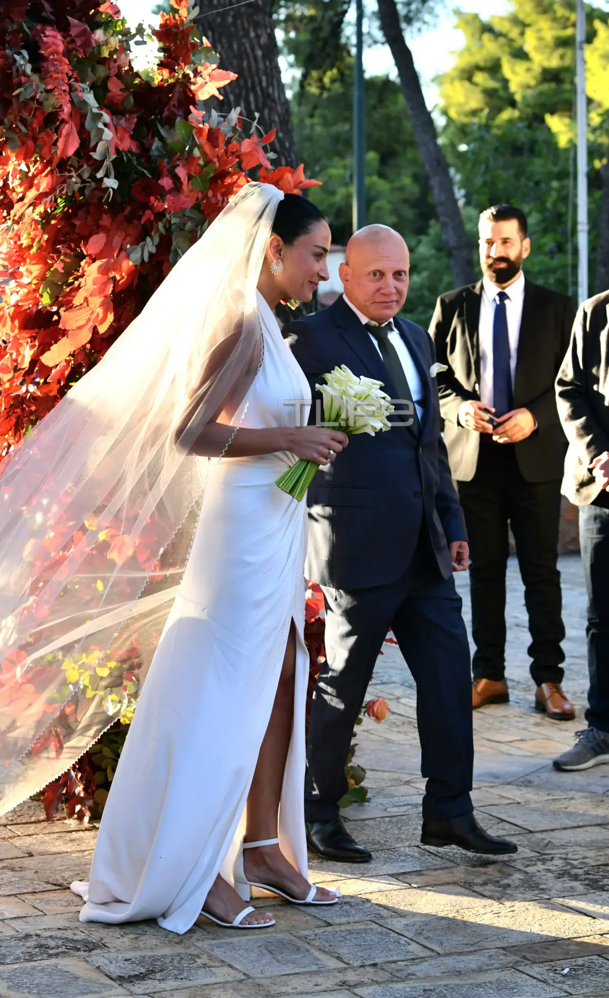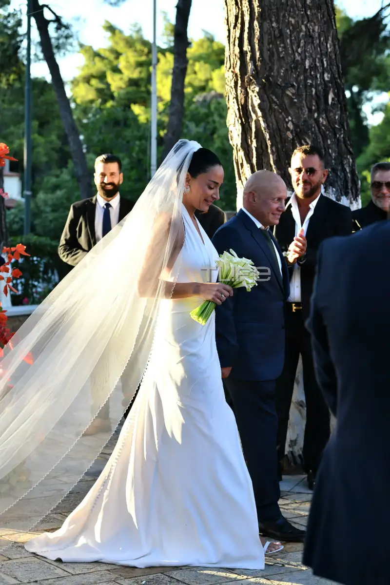 Η νύφη εντυπωσίασε με δημιουργία του σχεδιαστή Χρήστου Κωσταρέλου, ένα νυφικό με ανοιχτή πλάτη και σκίσιμο στο μπροστινό μέρος, ολοκληρωμένο με μακρύ πέπλο στα μαλλιά της. Κατά την άφιξή της, οι παρευρισκόμενοι την υποδέχθηκαν με παρατεταμένα χειροκροτήματα και χαμόγελα.