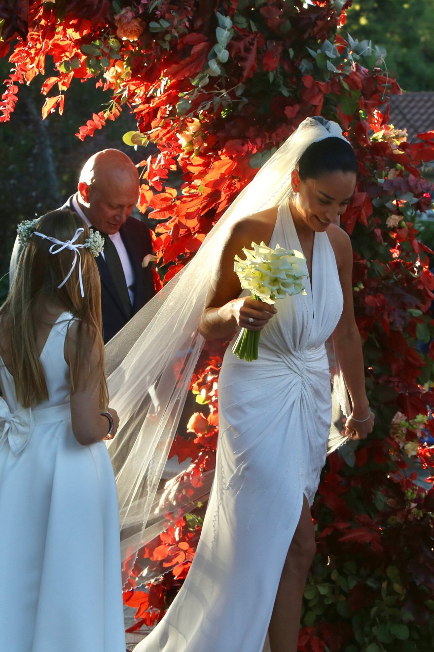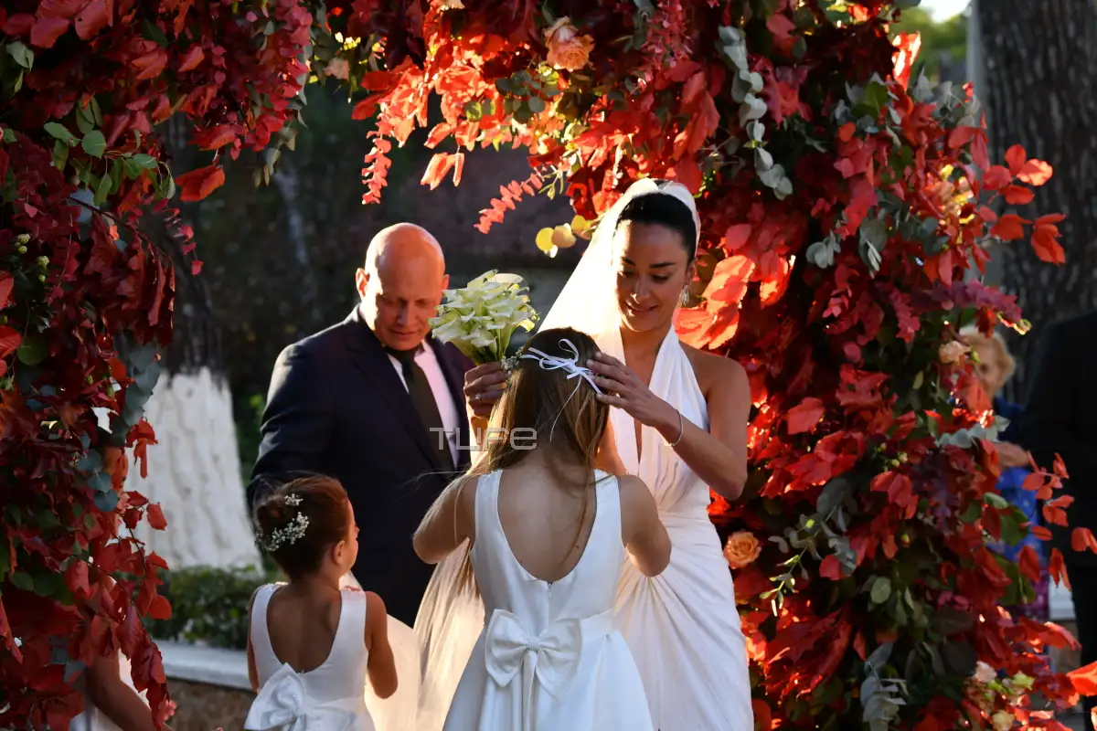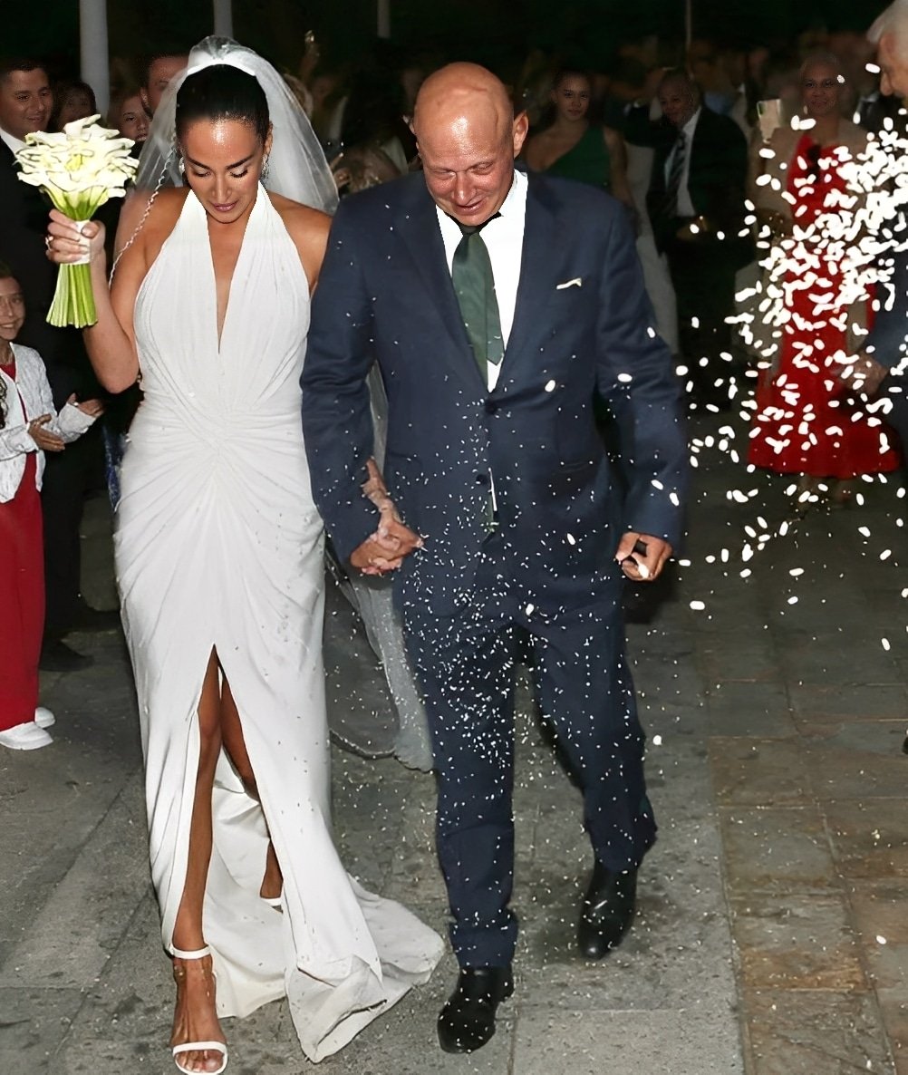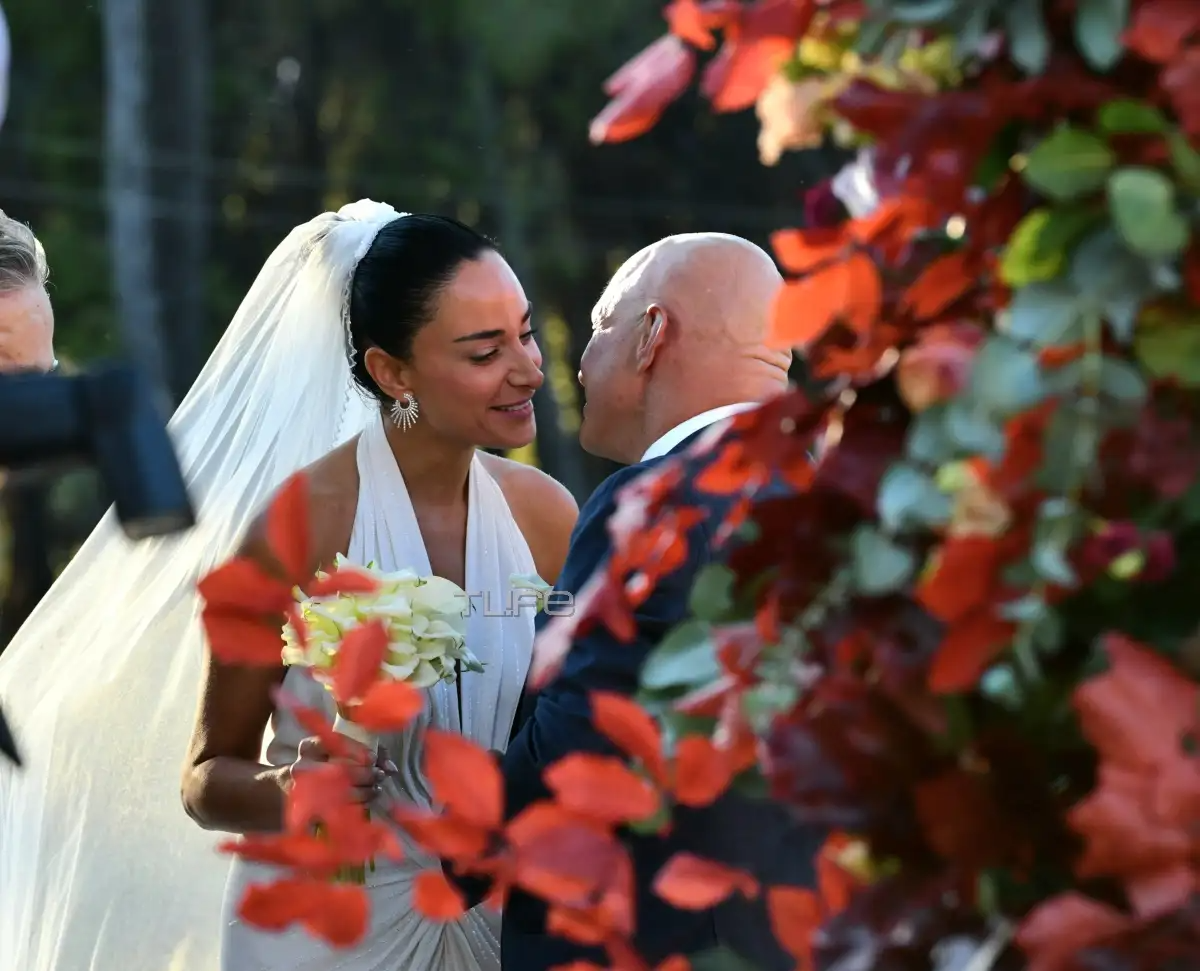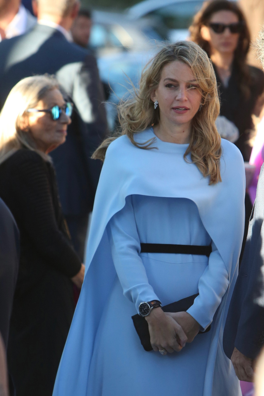Η νύφη εντυπωσίασε με δημιουργία του σχεδιαστή Χρήστου Κωσταρέλου, ένα νυφικό με ανοιχτή πλάτη και σκίσιμο στο μπροστινό μέρος, ολοκληρωμένο με μακρύ πέπλο στα μαλλιά της. Κατά την άφιξή της, οι παρευρισκόμενοι την υποδέχθηκαν με παρατεταμένα χειροκροτήματα και χαμόγελα.