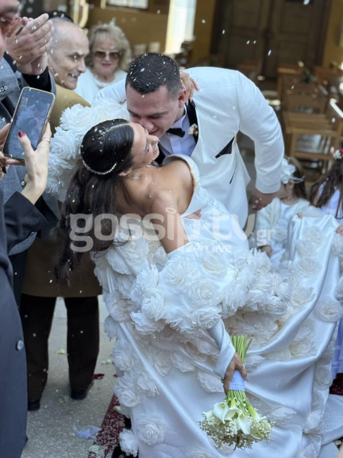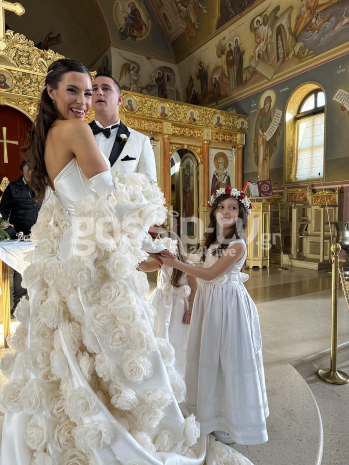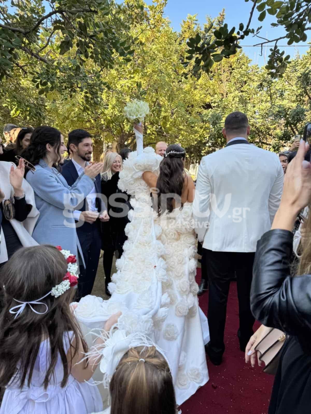Η νύφη εντυπωσίασε με την επιλογή της, φορώντας ένα στράπλες λευκό νυφικό σε mermaid γραμμή, το οποίο συνδυαζόταν με μια εντυπωσιακή ουρά. Το νυφικό σχεδίασε ο οίκος νυφικών Bridal Loft Athens, υπό την καλλιτεχνική διεύθυνση της Φαίδρας Θεοδωρίδου.
