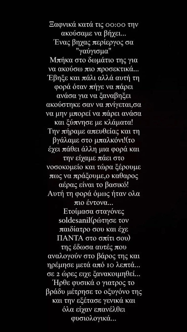«Έβηξε και πάλι αλλά αυτή τη φορά, όταν πήρε ανάσα για να ξαναβήξει ακούστηκε σαν να πνίγεται, σαν να μην μπορεί να πάρει ανάσα και ξύπνησε με κλάματα. Την πήραμε απευθείας και την βγάλαμε στο μπαλκόνι, το είχε πάθει άλλη μια φορά και την είχαμε πάει στο νοσοκομείο. Τώρα ξέρουμε πώς να πράξουμε, ο καθαρός αέρας είναι το βασικό», ανέφερε μεταξύ άλλων η Ελένη Χατζίδου, ενώ στη συνέχεια τόνισε πως έδωσε τις κατάλληλες σταγόνες στη μικρή της.