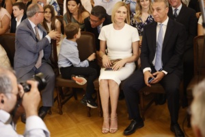 Το ζευγάρι κατευθύνθηκε στο εσωτερικό του χώρου όπου ο πρώην υπουργός Τουρισμού ανέλαβε το νέο του πόστο στην κυβέρνηση, ως Υπουργός Κλιματικής Κρίσης και Πολιτικής Προστασίας.