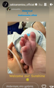 Μέσα από το προσωπικό του προφίλ στο Instagram, ο τραγουδιστής μοιράστηκε μερικές φωτογραφίες με τον γιο και τη σύζυγό του, από το μαιευτήριο και λίγο μετά τη γέννα. Στο ένα από τα στιγμιότυπα, ο Σάκης Αρσενίου κρατά το μωρό στην αγκαλιά του και χαμογελά. Την φωτογραφία συνόδευσε με το μήνυμα: