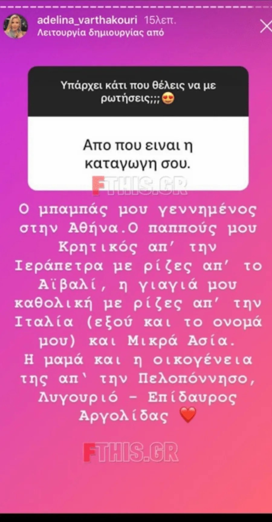 Η μαμά και η οικογένεια της από την Πελοπόννησο, Λυγουριό -Επίδαυρος, Αργολίδας”, έγραψε χαρακτηριστικά η Αντελίνα Βαρθακούρη.