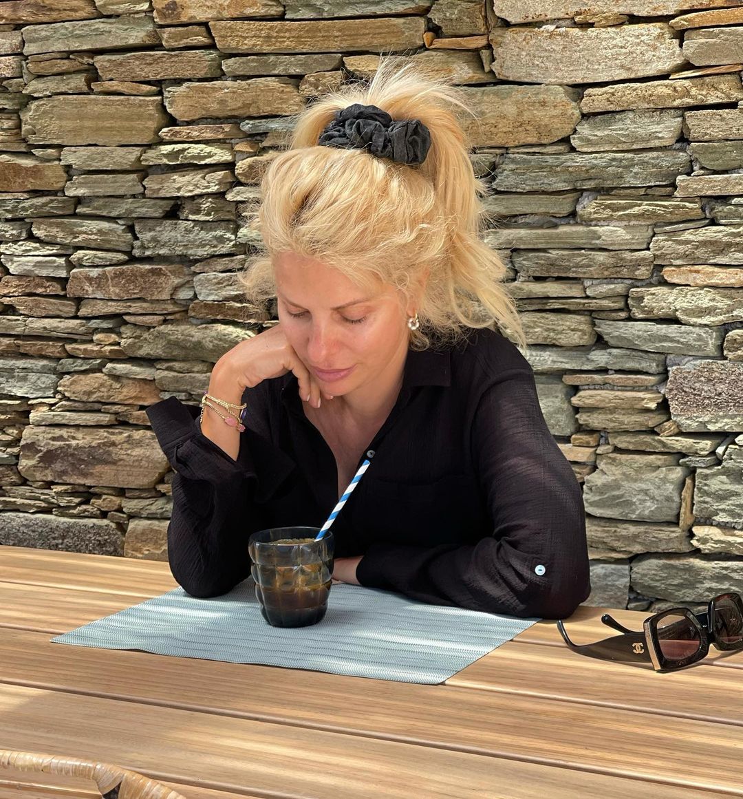 Η Ελένη Μενεγάκη περνάει στιγμές χαλάρωσης και ξενοιασιάς στο σπίτι της στα Άχλα της Άνδρου, με την οικογένειά της.
