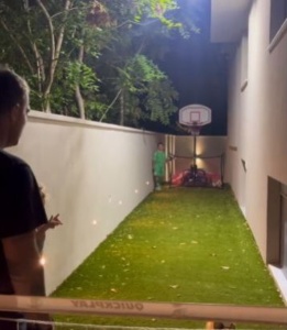 Στο εξωτερικό του σπιτιού τους έχουν πισίνα αλλά και ένα μικρό γηπεδάκι, στο οποίο ο Στέλιος Χανταμπάκης παίζει μπάλα με τα παιδιά του, ως επί το πλείστον με τον γιο του.