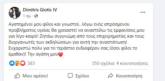 «Αγαπημένοι μου φίλοι και γνωστοί… λόγω ενός απρόσμενου προβλήματος υγείας θα χρειαστεί να αναστείλω τις εμφανίσεις μου για λίγο καιρό! Ζητάω συγγνώμη από τους επιχειρηματίες και τους διοργανωτές των εκδηλώσεων για αυτή την αναστάτωση! Ευχαριστώ πολύ για το τεράστιο ενδιαφέρον σας (όσοι φίλοι το έμαθαν)! Την αγάπη μου» και όπως ήταν φυσικό, εισέπραξε πολλά σχόλια αγάπης και στήριξης από φίλους, γνωστούς και θαυμαστές.