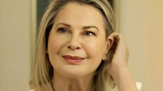 Η Ελένη Ερήμου φορούσε μια elegant loose-fit μπλούζα με διακριτικά φλοράλ μοτίβα σε γήινες και παστέλ αποχρώσεις,, συνδυασμένη με ψηλόμεσο παντελόνι σε navy blue που χαρίζει ύψος και minimal φινέτσα. Το look της αποπνέει διαχρονική θηλυκότητα, ενώ οι απλές χρυσές λεπτομέρειες στα κοσμήματα προσθέτουν διακριτική πολυτέλεια.