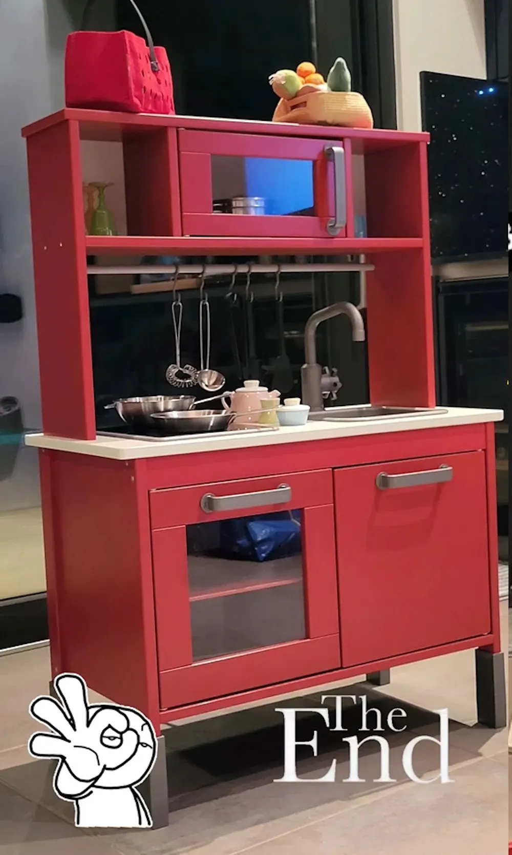 Έτσι ,χθες, Πέμπτη, το βράδυ, συναρμολόγησε την κόκκινη παιδική κουζίνα και υπογράμμισε «Πώς μας την έφερε έτσι βραδιάτικα ο μικρός», δημοσιεύοντας τα κομμάτια της κατασκευής και στη συνέχεια έδειξε το τελικό αποτέλεσμα.