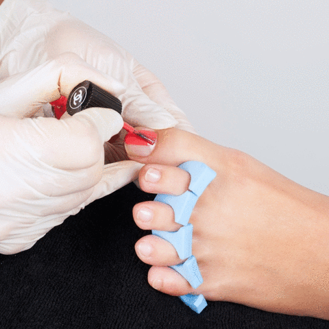 Αφαιρέστε τη λιπαρότητα με ασετόν ή οινόπνευμα από τα νύχια. Στη συνέχεια βάλτε τους ειδικούς νάρθηκες στα πόδια για να ξεχωρίσετε τα δάχτυλα μεταξύ τους και περάστε τη βάση. Αφού τραβήξει περνάτε την πρώτη στρώση μανό και στη συνέχεια μετά από λίγα λεπτά την επόμενη.