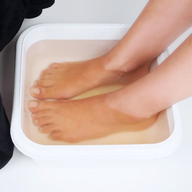 Γεμίστε μια λεκάνη με χλιαρό νερό και άλατα μπάνιου. Τα αρωματικά και αναζωογονητικά άλατα μπάνιου, για τον καθαρισμό του δέρματος φροντίζουν να ξεκουράσουν τα πόδια και να μαλακώνουν το δέρμα.