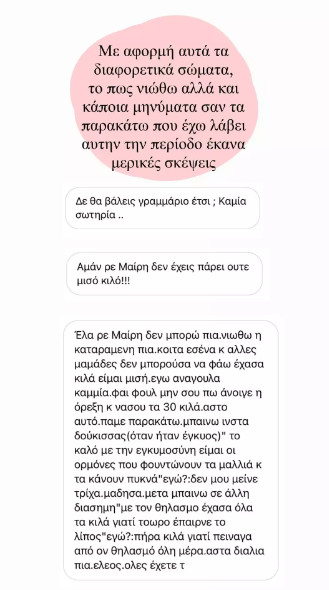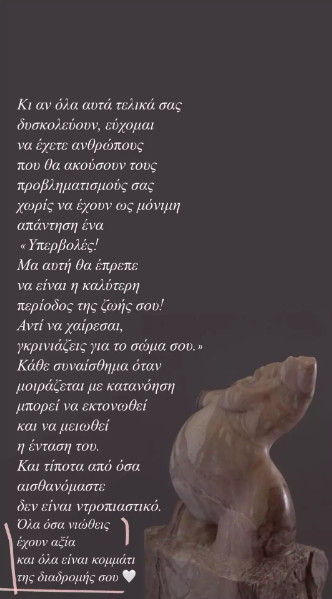 «Με αφορμή αυτά τα διαφορετικά σώματα, το πώς νιώθω αλλά και κάποια μηνύματα σαν αυτά που έχω λάβει αυτή την περίοδο, έκανα μερικές σκέψεις… Εύχομαι όσες βρίσκεστε στην ίδια κατάσταση να βιώνετε με ηρεμία τις αλλαγές στο σώμα σας. Να είναι μια ομαλή μετάβαση που δεν θα σας αγχώνει. Να έχετε στο περιβάλλον σας ανθρώπους που δεν θα κάνουν άβολα σχόλια για το βάρος σας, το μέγεθος της κοιλιάς σας, τους στήθους σας, τις ραγάδες σας. Να κοιτάτε το σώμα σας με μάτια που ευγνωμονούν αυτό που καταφέρνει αυτή τη στιγμή. Και προς Θεού! Να μη συγκρίνετε το δικό σας κορμί με οποιαδήποτε άλλη. Η σύγκριση είναι ο πιο σίγουρος δρόμος προς την ανασφάλεια.