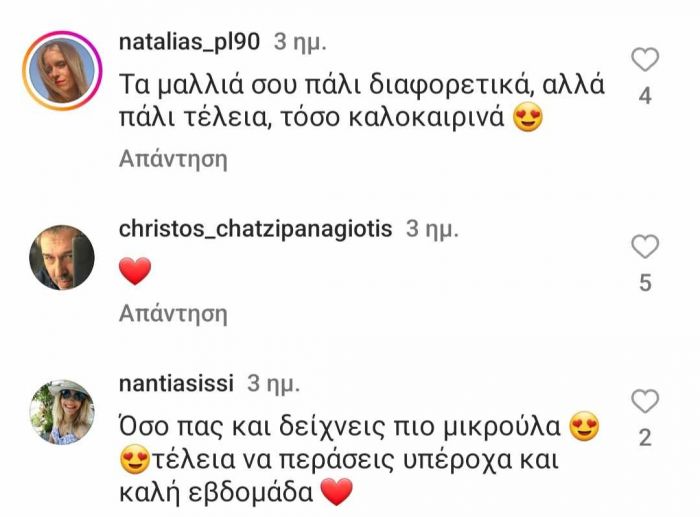 Στην Κέρκυρα η τραγουδίστρια, καθώς βρισκόταν σε καλοκαιρινό mood κι εφόσον ήταν σε μια παύση από τις επαγγελματικές της υποχρεώσεις, άφησε και τα μαλλιά της τελείως φυσικά.