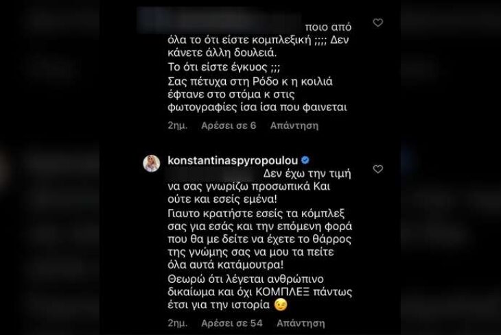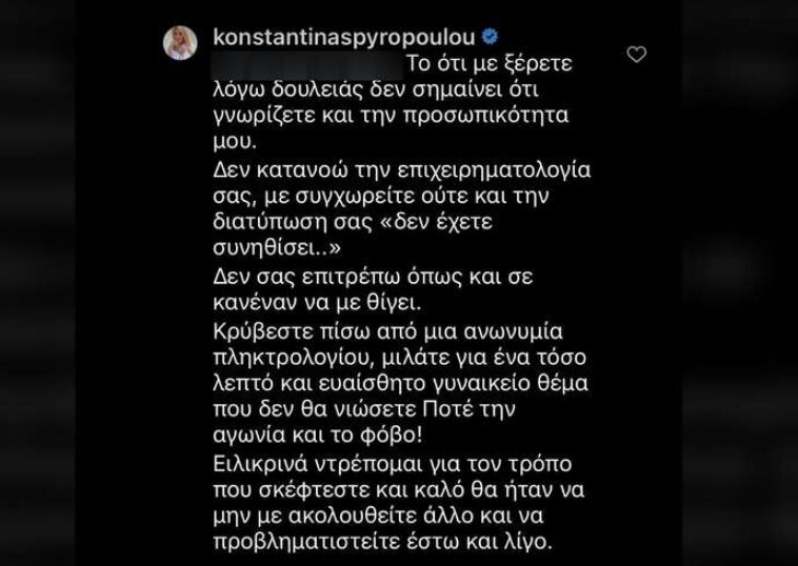Και συμπληρώνει η Κωνσταντίνα Σπυροπούλου «Το ότι με ξέρετε λόγω δουλειάς δεν σημαίνει ότι γνωρίζετε και την προσωπικότητα μου. Δεν κατανοώ την επιχειρηματολογία σας, με συγχωρείτε ούτε και την διατύπωση σας “δεν έχετε συνηθίσει”. Δεν σας επιτρέπω όπως και σε κανέναν να με θίγει. Κρύβεστε πίσω από μια ανωνυμία πληκτρολογίου, μιλάτε για ένα τόσο λεπτό και ευαίσθητο γυναικείο θέμα που δεν θα νιώσετε ποτέ την αγωνία και το φόβο! Ειλικρινά ντρέπομαι για τον τρόπο που σκέφτεστε και καλό θα ήταν να μην με ακολουθείτε άλλο και να προβληματιστείτε έστω και λίγο».