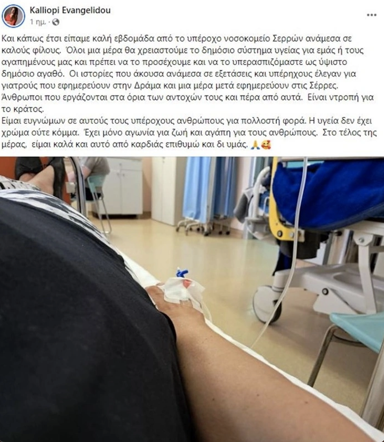 «Και κάπως έτσι είπαμε καλή εβδομάδα από το υπέροχο νοσοκομείο Σερρών ανάμεσα σε καλούς φίλους. Όλοι μια μέρα θα χρειαστούμε το δημόσιο σύστημα υγείας για εμάς ή τους αγαπημένους μας και πρέπει να το προσέχουμε και να το υπερασπιζόμαστε ως ύψιστο δημόσιο αγαθό.