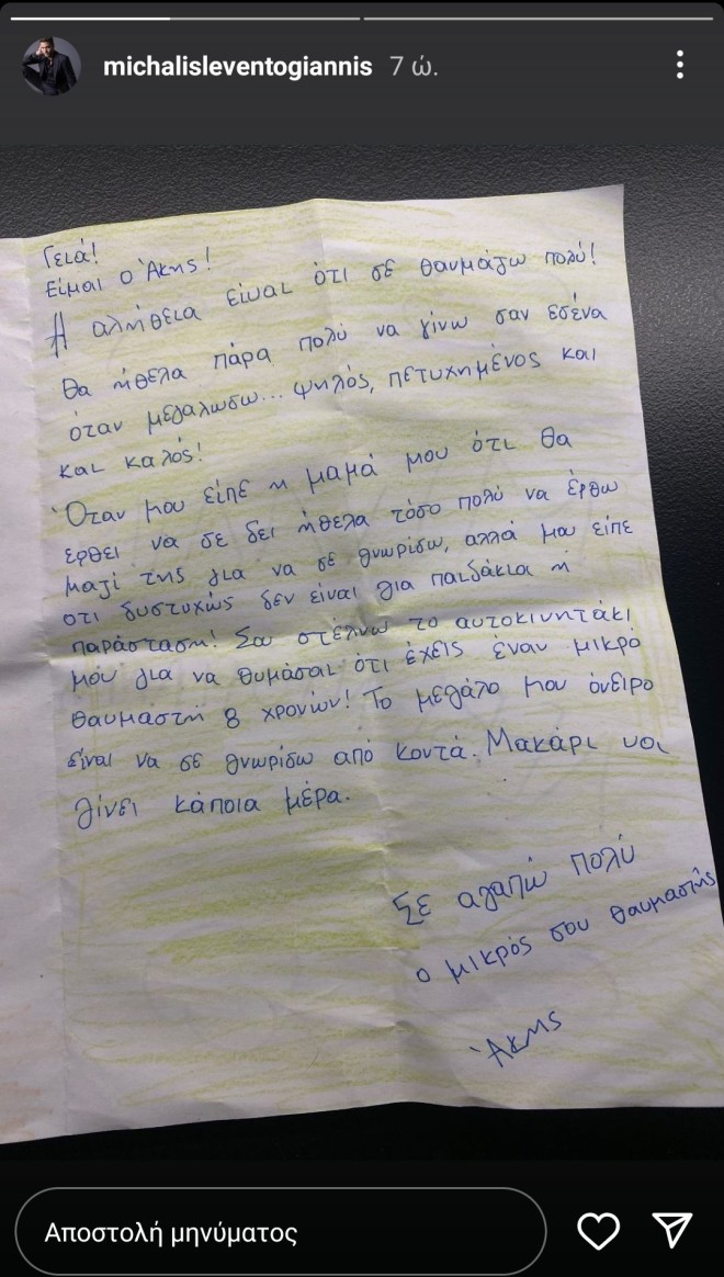 Ένα πολύ συγκινητικό γράμμα μοιράστηκε ο Μιχάλης Λεβεντογιάννης, το οποίο του έστειλε ένας μικρός θαυμαστής του.