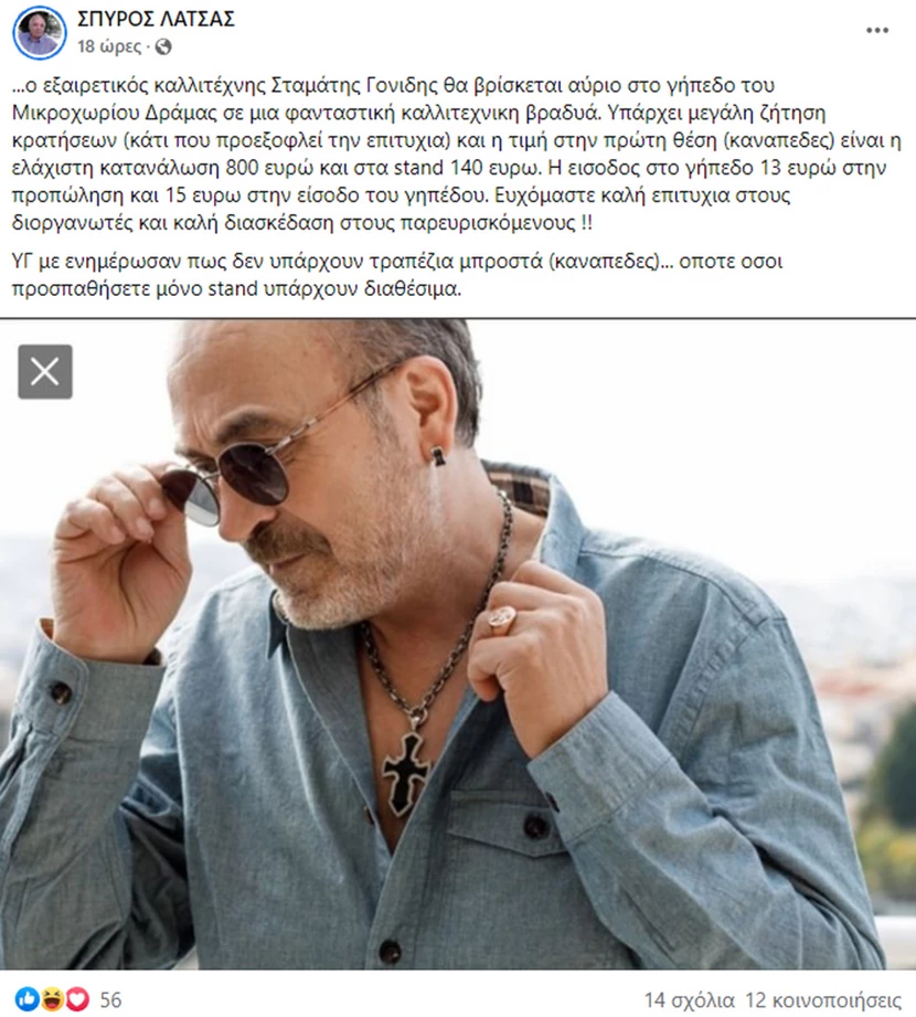 «Ο εξαιρετικός καλλιτέχνης Σταμάτης Γονίδης θα βρίσκεται αύριο στο γήπεδο του Μικροχωρίου Δράμας σε μια φανταστική καλλιτεχνική βραδιά. Υπάρχει μεγάλη ζήτηση κρατήσεων (κάτι που προεξοφλεί την επιτυχία) και η τιμή στην πρώτη θέση (καναπέδες) είναι η ελάχιστη κατανάλωση 800 ευρώ και στα stand 140 ευρώ» σημείωσε την Τετάρτη (29/6) σε ανάρτηση του ο Σπύρος Λάτσας ο οποίος είναι κάτοικος της περιοχής.