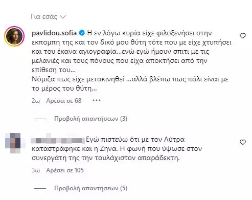 Η ηθοποιός Σοφία Παυλίδου με σχόλιο κάτω από την ανάρτηση αναφέρθηκε στη δική της επίθεση ξυλοδαρμού μετά την καταγγελία της κατά του συναδέλφου της, Μάνου Παπαγιάννη.