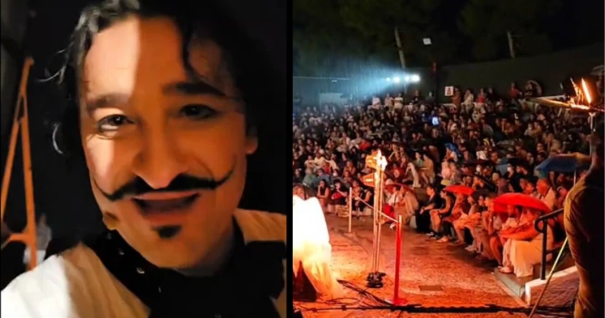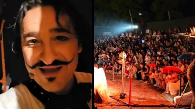 «Βρέχει στο Βόλο και το γεμάτο θέατρο παραμένει γεμάτο. Ζούμε πολύ όμορφες στιγμές. Η μαγεία του θεάτρου έκανε το θαύμα της. Είναι σαν νυχτερινό μπάνιο βλέποντας θέατρο. Είναι μαγεία» ακούγεται να λέει ο ηθοποιός που τράβηξε βίντεο από τα παρασκήνια.