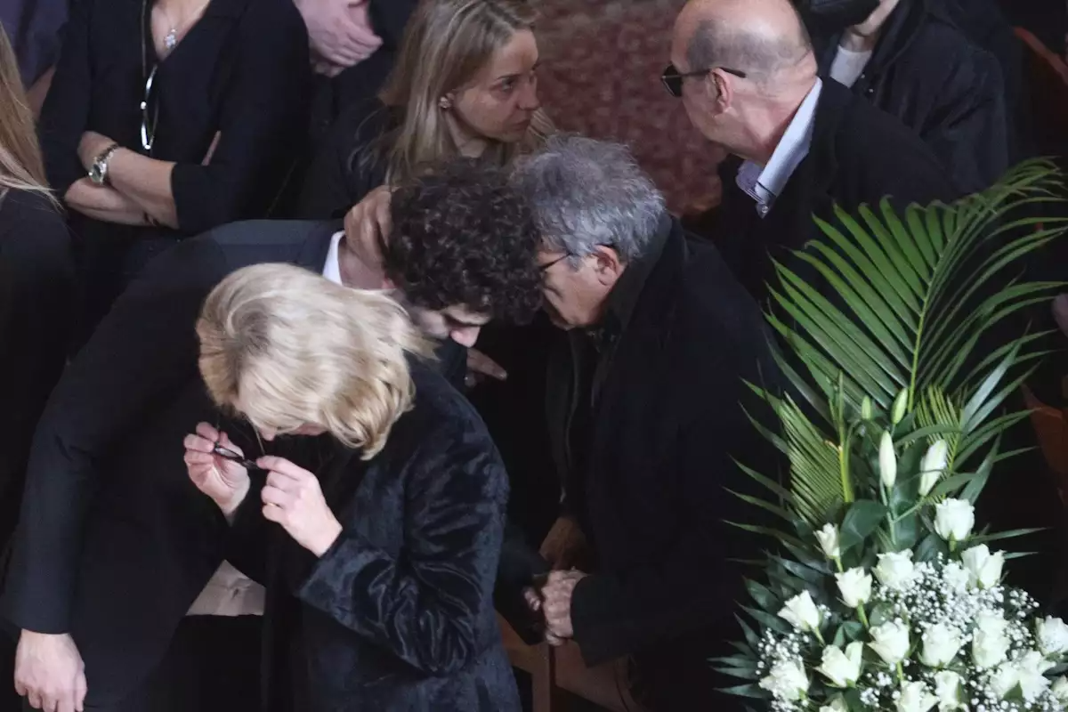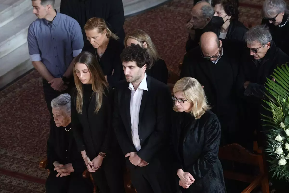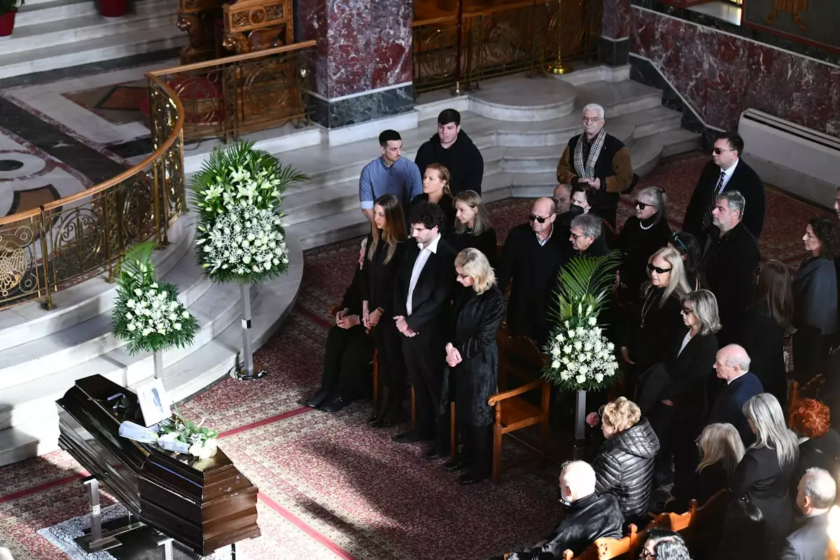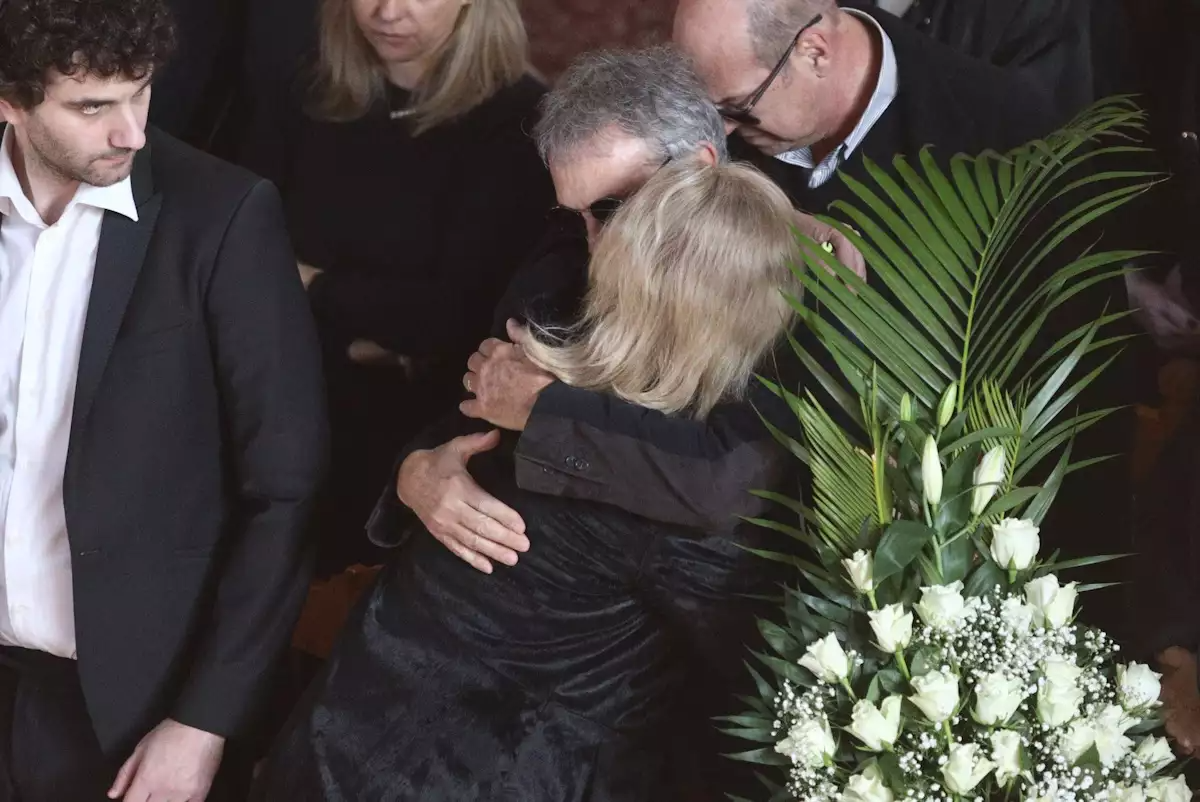 Η σύζυγος του δημοσιογράφου δεν μπόρεσε να κρύψει τη συγκίνησή της μέσα στον Ιερό Ναό της Παναγίτσας Παλαιού Φαλήρου, την ώρα που ο Γιώργος Νταλάρας, στενός φίλος της οικογένειας, την αγκάλιασε σφιχτά.