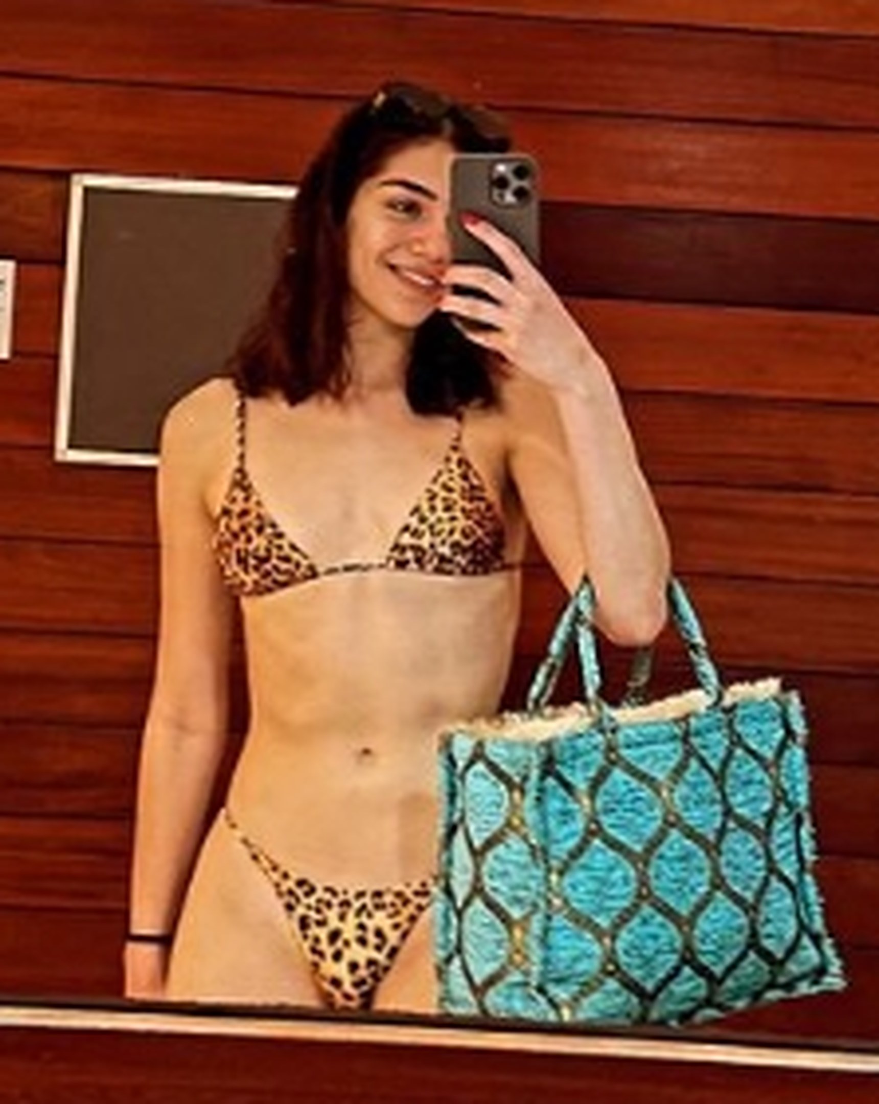 Φορώντας ένα μικροσκοπικό λεοπάρ μπικίνι, η Μελίνα αναδεικνύει τον γυμνασμένο κορμό της με τον πιο κολακευτικό τρόπο. Το μπικίνι της αποκαλύπτει την εξαιρετική της φυσική φόρμα, ενώ διατηρεί μια τυρκουάζ τσάντα παραλίας για τα απαραίτητα είδη.