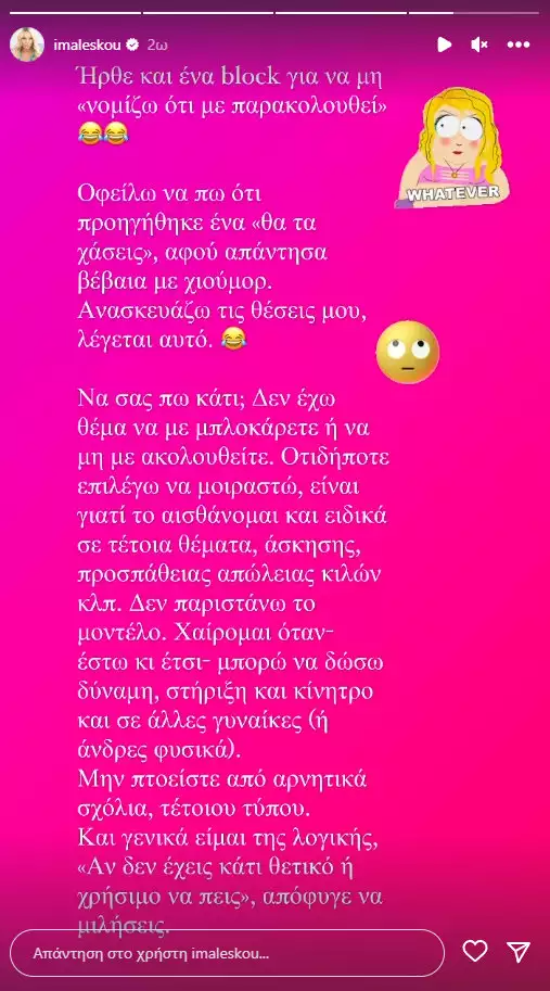 Όπως υπογράμμισε η Ιωάννα Μαλέσκου στον προσωπικό της λογαριασμό στο instagram «Δεν έχω θέμα να με μπλοκάρετε ή να με μη με ακολουθείτε. Οτιδήποτε επιλέγω να μοιραστώ, είναι γιατί το αισθάνομαι και ειδικά σε τέτοια θέματα άσκησης, προσπάθειας απώλειας κιλών κλπ.