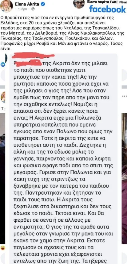 Όπως υπογραμμίζει η Έλενα Ακρίτα «ο γιος μου Παύλος κι εγώ ζητούμε “συγγνώμη” που σάς απασχολούμε με τα οικογενειακά μας. Δεν το έχουμε κάνει ποτέ τριάντα χρόνια τώρα! Όμως, εν όψει της μάχης που θα δώσουμε στα ποινικά και αστικά δικαστήρια, κρίναμε πως ο κόσμος πρέπει να γνωρίζει όλη την αλήθεια και να μην πιστεύει τους ψεύτες και τους συκοφάντες. Η νόμιμη διαδικασία υιοθεσίας που ακολουθήθηκε ήταν η διακρατική υιοθεσία (Σύμβαση της Χάγης 29/5/1993), στην οποία συμμετείχε και η Πρεσβεία της χώρας γέννησης του παιδιού.