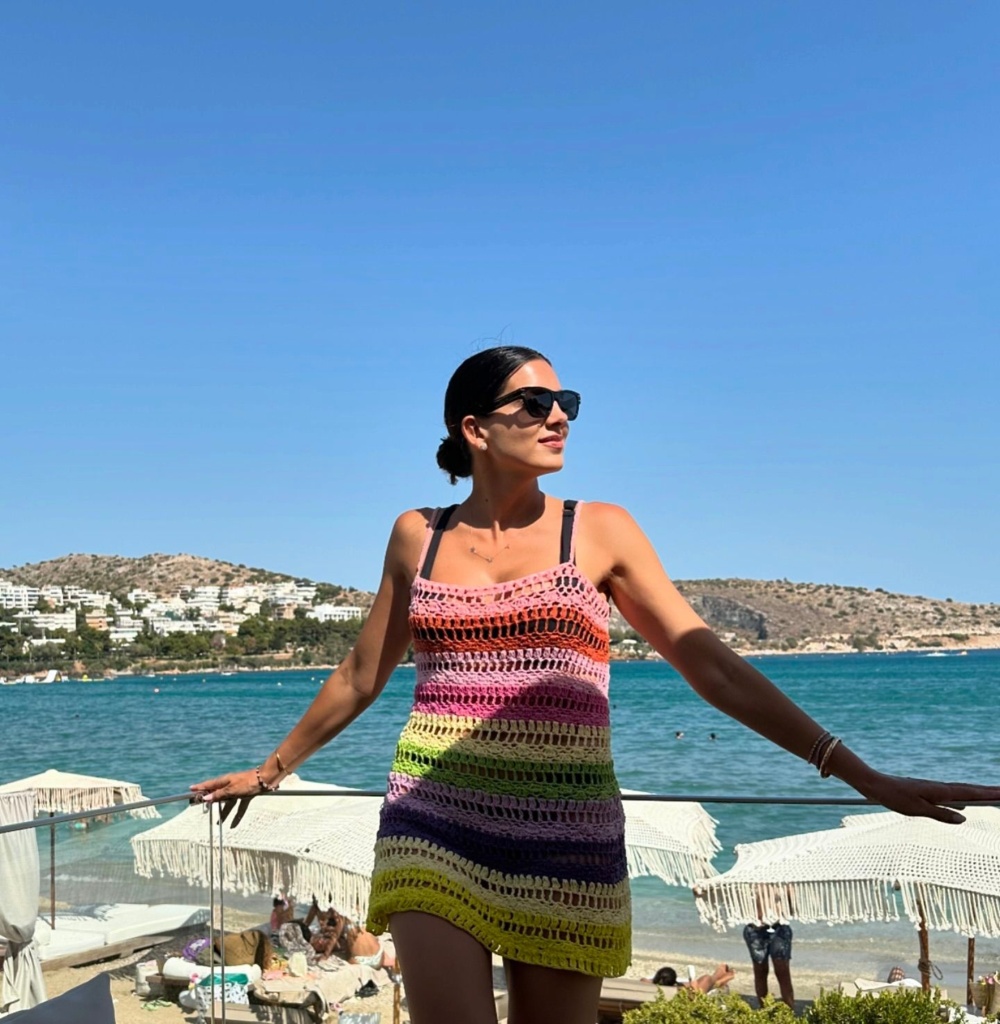 Μαζί όμως με αυτές τις φωτογραφίες παρατηρήσαμε και το υπέροχο πλεκτό φόρεμα παραλίας που επέλεξε. Μίνι με όλα τα χρώματα της παλέτας κι από μέσα φαινόταν διακριτικά το μαύρο της μπικίνι.