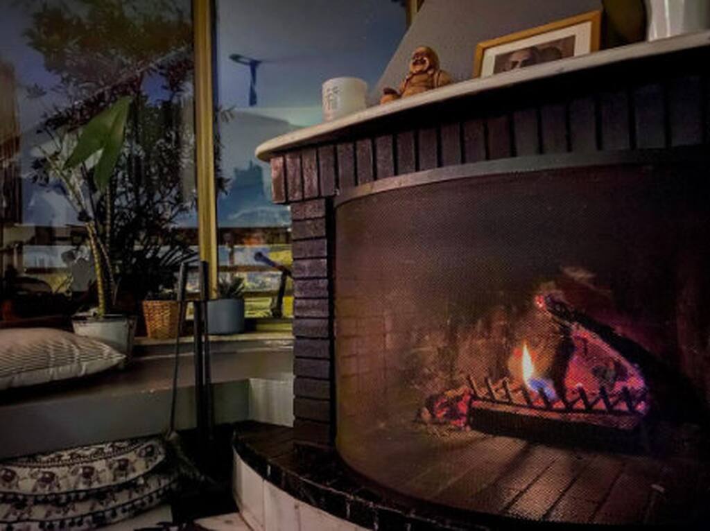 Στο καθιστικό, τα βλέμματα τραβάει το υπέροχο τζάκι στο κέντρο της τζαμαρίας, ενώ ο χώρος είναι διακοσμημένος με σουβενίρ από τα ταξίδια τους, πίνακες ζωγραφικής και πολλά πολλά φυτά και βιβλία.